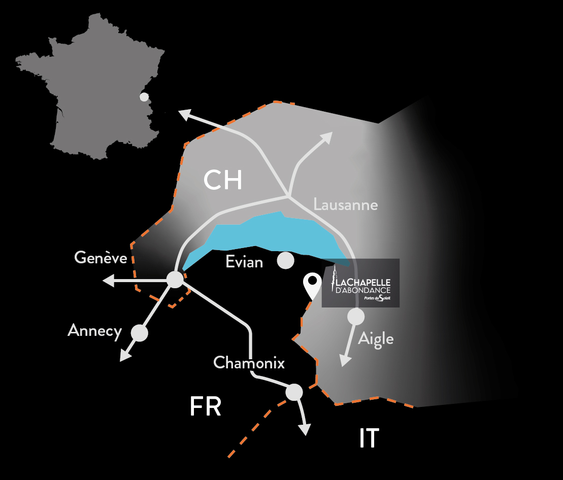 Située au coeur des Portes du Soleil, entre lac Léman et Mont-Blanc, La Chapelle d'Abondance se trouve à 20 min des autoroutes suisses, à 30 min de la gare de Aigle, à 1h30 de l'aéroport international de Genève Cointrin et à 45 min de la gare de Thonon-les-Bains.